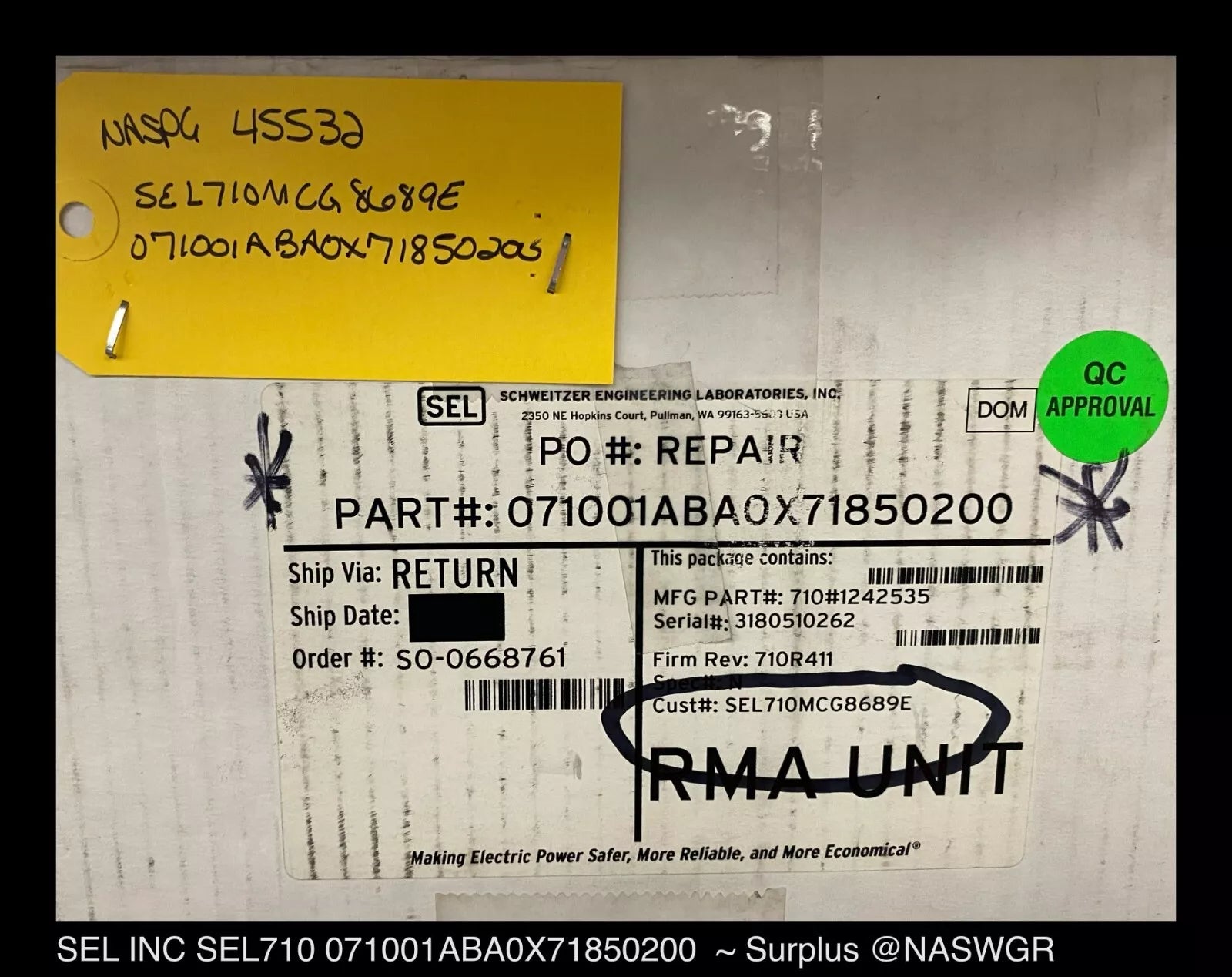 Schweitzer 071001ABA0X771850200 SEL-710 Motor Relay Protection - Surplus