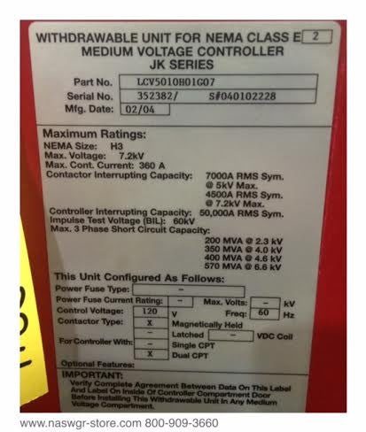 LCV5010H01G07 ~ Square D LCV5010H01G07 Withdrawable Unit for Nema Class E2 Medium Voltage Controller